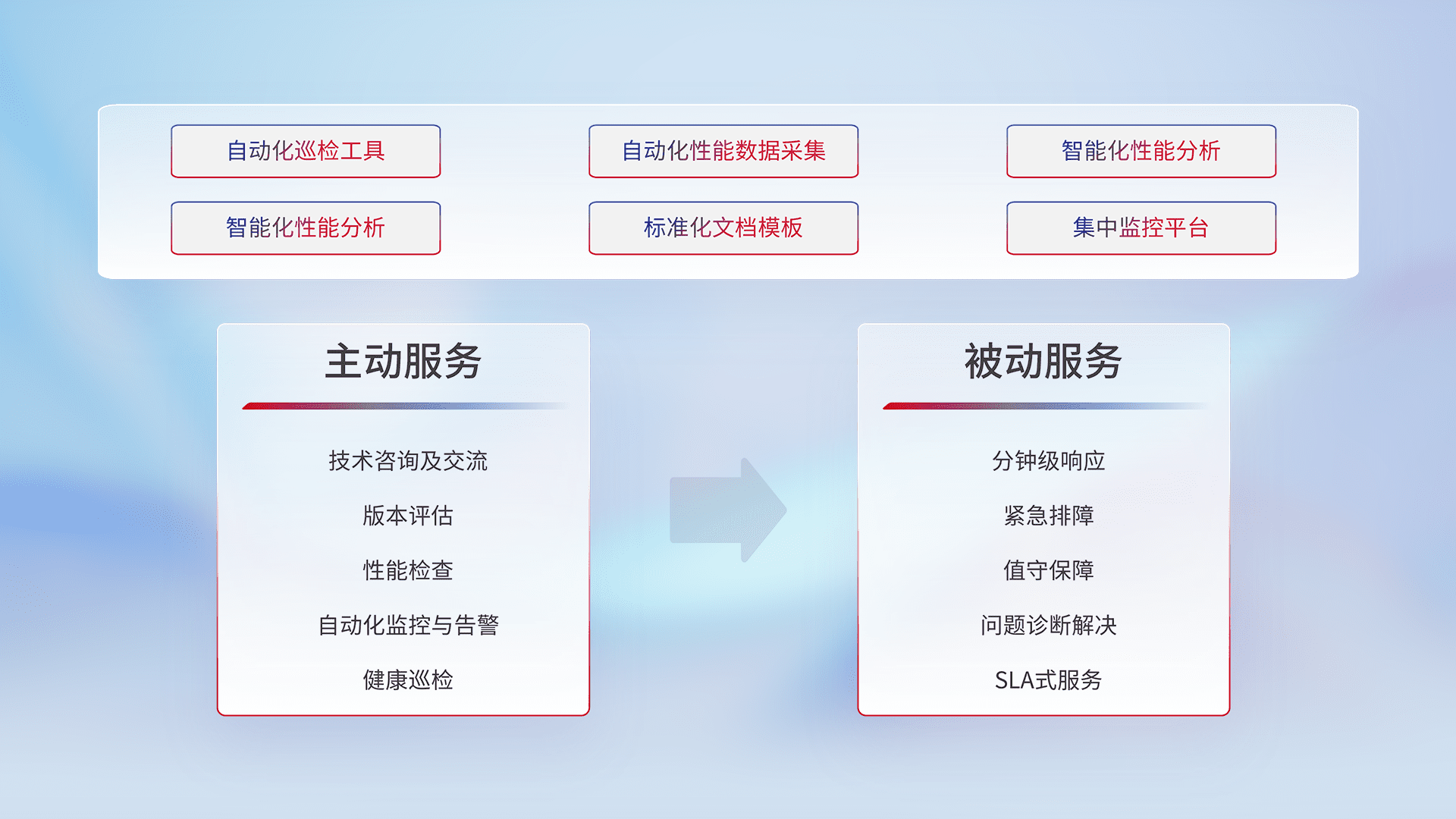 智能化工具和标准化文档,,保障服务质量,,提供主动服务(包含技术咨询、、版本评估、、性能检查、、、、自动化监控与告警、、、健康巡检)和被动服务包含(分钟级响应、、、紧急排障、、、值守保障、、、、问题诊断解决、、SLA服务)。。。。